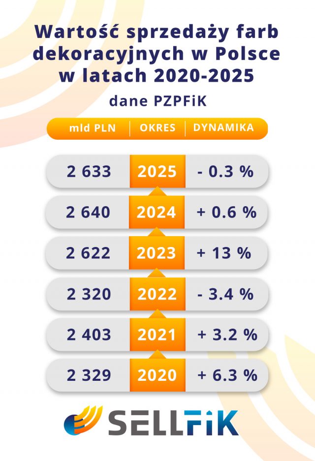 W 2025 roku branża farb dekoracyjnych – stanowiąca największy segment rynku – zanotowała minimalny spadek wartości sprzedanych farb o -0,3% r/r do 2,63 mld PLN (w roku 2024 zanotowano wzrost 0,6%), przy jednoczesnym niewielkim spadku ich wolumenu liczonego w litrach o -2,5% r/r (w 2024 r. było to -3,5%). Wyniki powstały na bazie raportu SellFiK przygotowanego dla Polskiego Związku Producentów Farb i Klejów.
